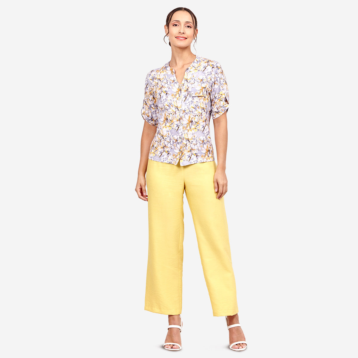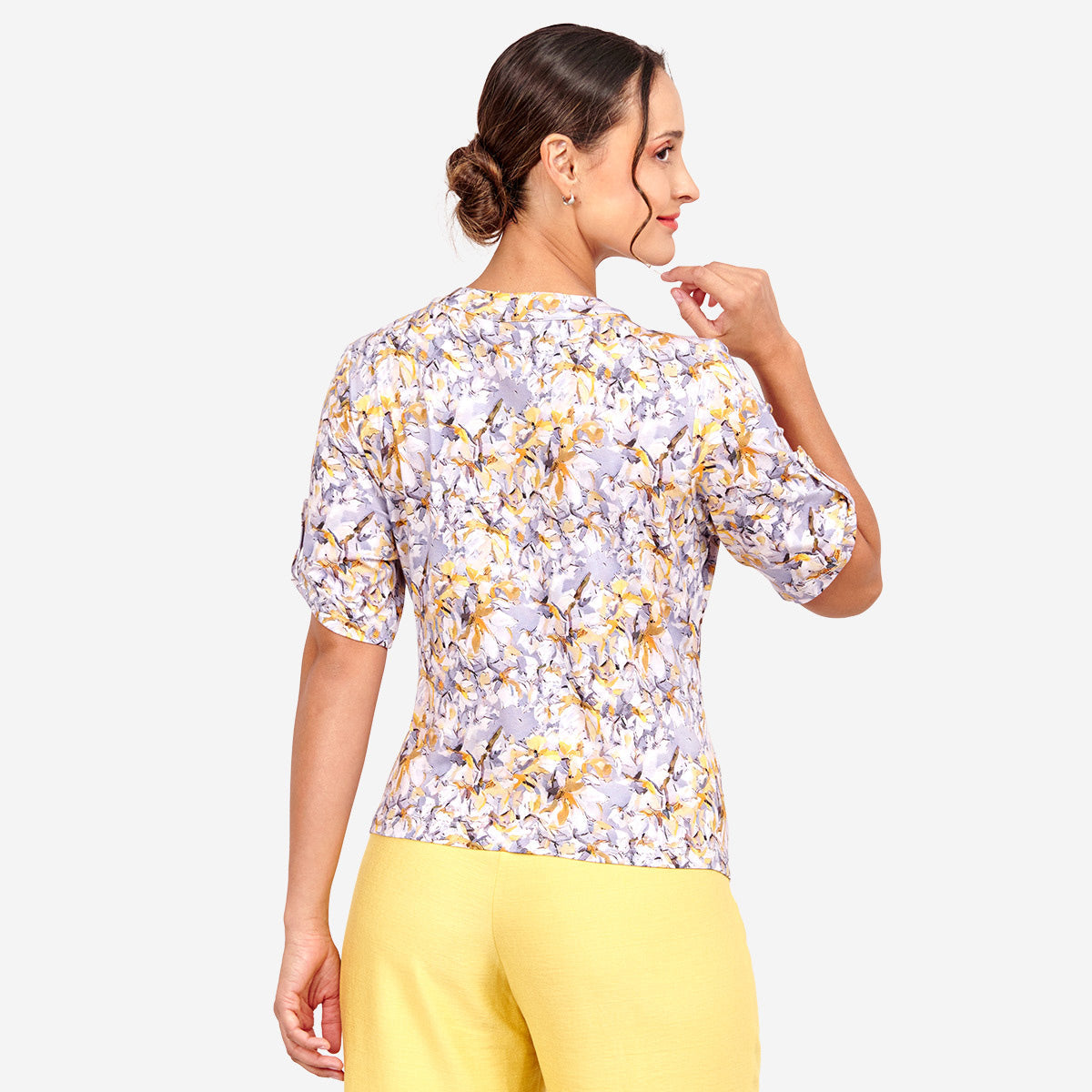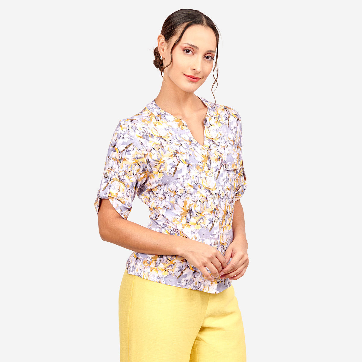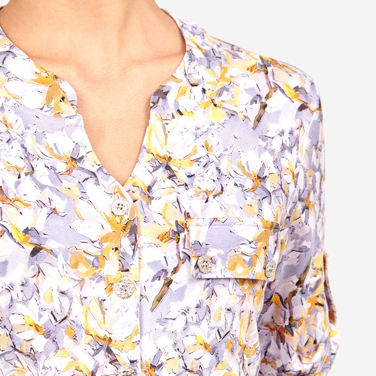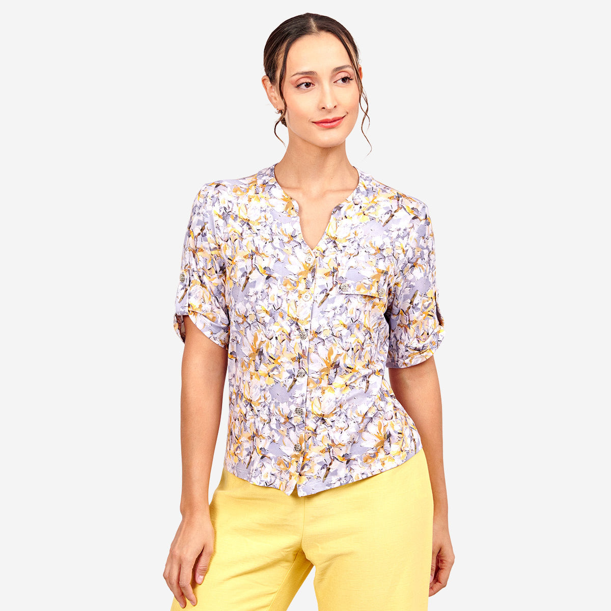 Blusa de estampado floral con botones al frente y manga 3/4 con elevadores